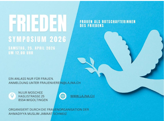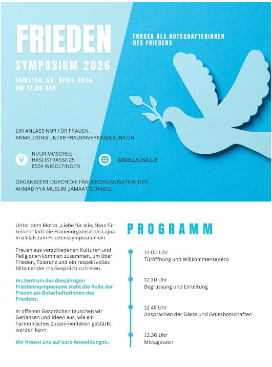 Lajna Imaillah, Frauenorganisation der Ahmadiyya Muslim Jamaat Schweiz läd Sie herzlich zur diesjährige Frieden Symposium am 25. April 2026 um 12:00 Uhr in Noor Moschee, Wigoltingen ein.